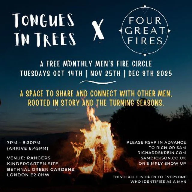 Rich and Tongues in Trees are proud to partner with the good people at Four Great Fires to offer this monthly Mens Group - a free monthly gathering around a fire in the heart of London. It is a space for men to share and connect, rooted in story and the turning seasons. To join us or for more info, get in touch here. See you around the fire…