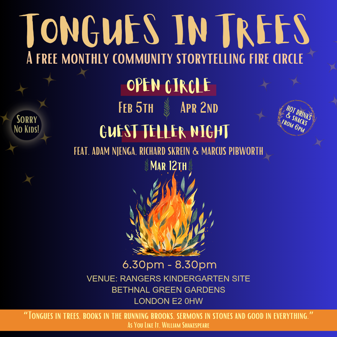 Alongside his storytelling partner Adam Njenga, he also holds Tongues in Trees - a free monthly community storytelling fire circle for adults.